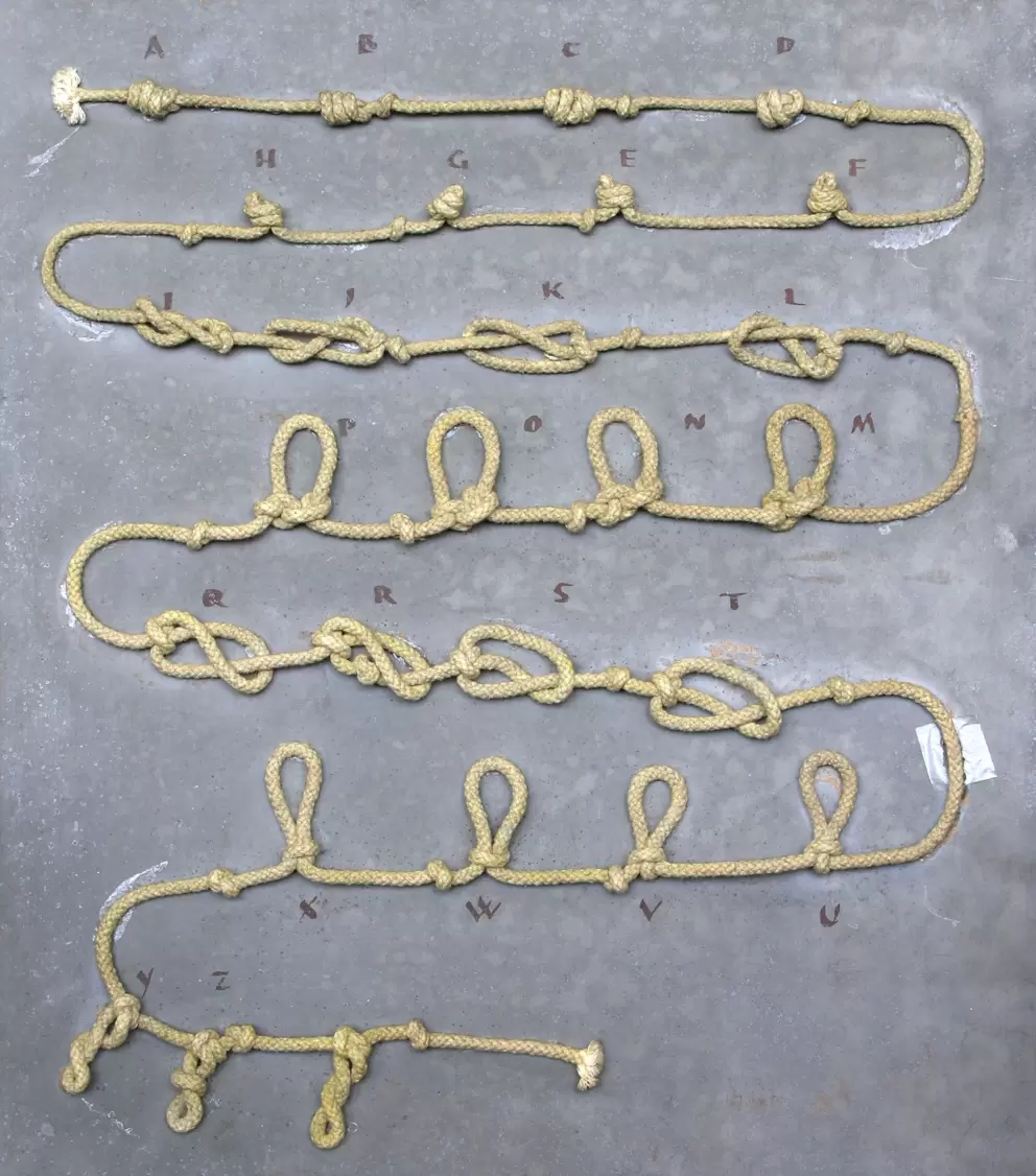 Na lesonitnoj ploči u obliku latiničnog slova S polegnut je konopac s čvorovima, koji predstavljaju abecedu pisma na vrpci ili čvorastog pisma. Svako slovo označeno je drugačijim čvorom. Abeceda ovog čvorastog pisma dobivena je pomoću vezivanja čvorova na vrpci koji se vežu tako da s obzirom na oblik, veličinu i položaj mogu označiti pojedine elemente govora, tj. glasove.