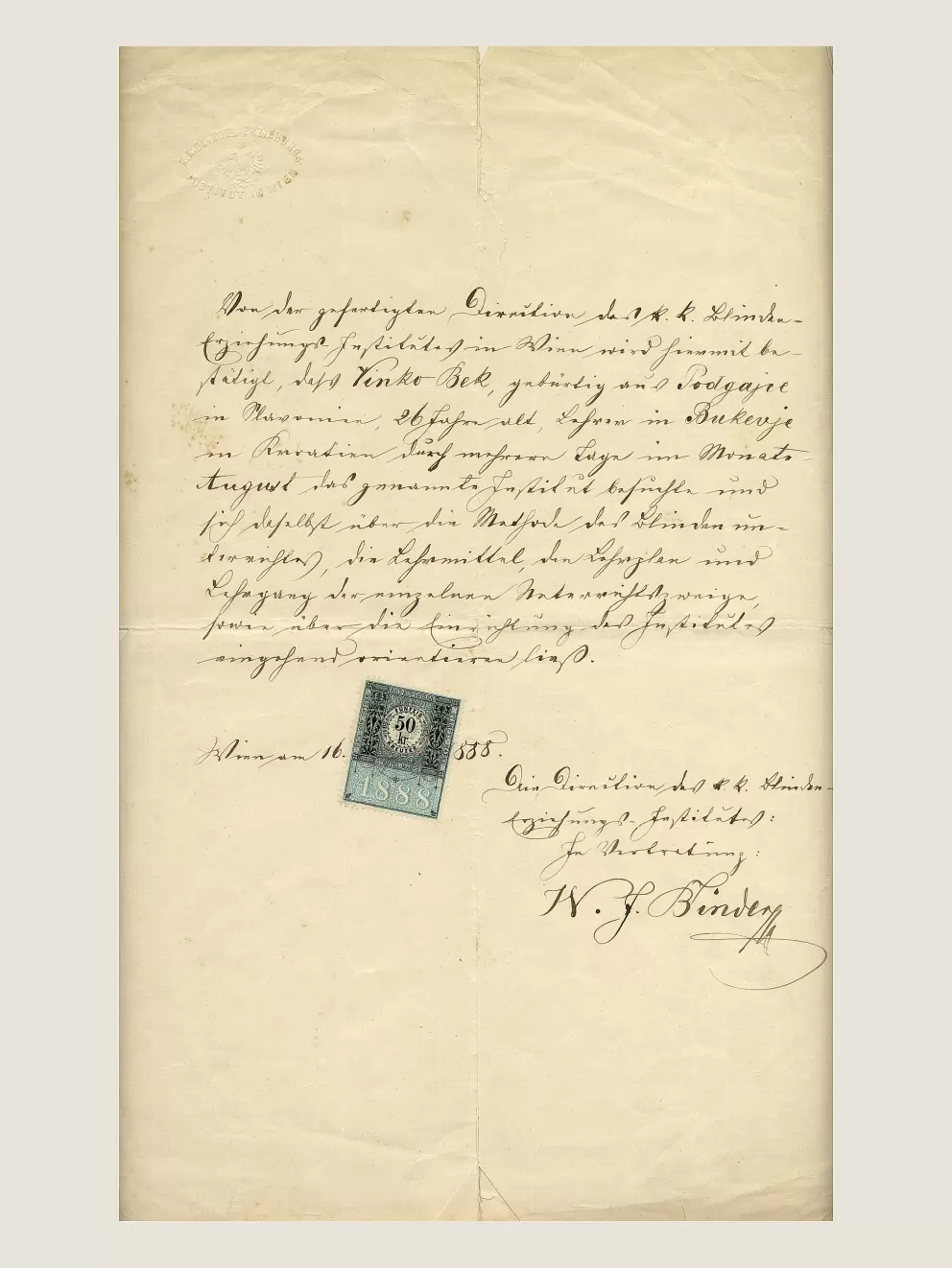 Potvrda K.K. Blinden-erziehungsinstitut u Beču o posjetu Vinka Beka