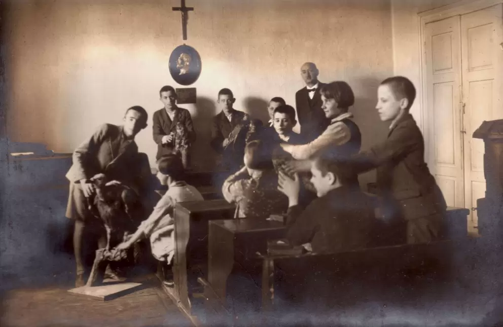 Izložena je uvećana fotografija učenika Zemaljskog zavoda za odgoj slijepe djece na satu prirodopisa. Originalna fotografija snimljena je oko 1920. godine u Zagrebu.