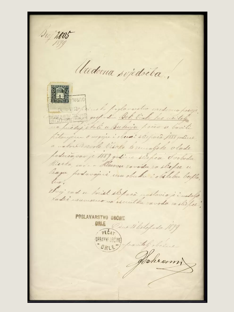 Rukopisna svjedodžba općine Orle, kojom se potvrđuje da se Vinko Bek, učitelj u Bukevju, počeo baviti pitanjem odgoja i obuke slijepaca 1888. godine. Navodi se da je nakon dozvole Visoke zemaljske vlade besplatno podučavao slijepca Hinka Svobodu, te da je svoj rad u korist slijepih i na osnutku zavoda za slijepe nastavio i dalje neumorno obavljati. Svjedodžba je ovjerena pečatom i potpisom upravitelja općine, 21. listopada 1899. godine.
