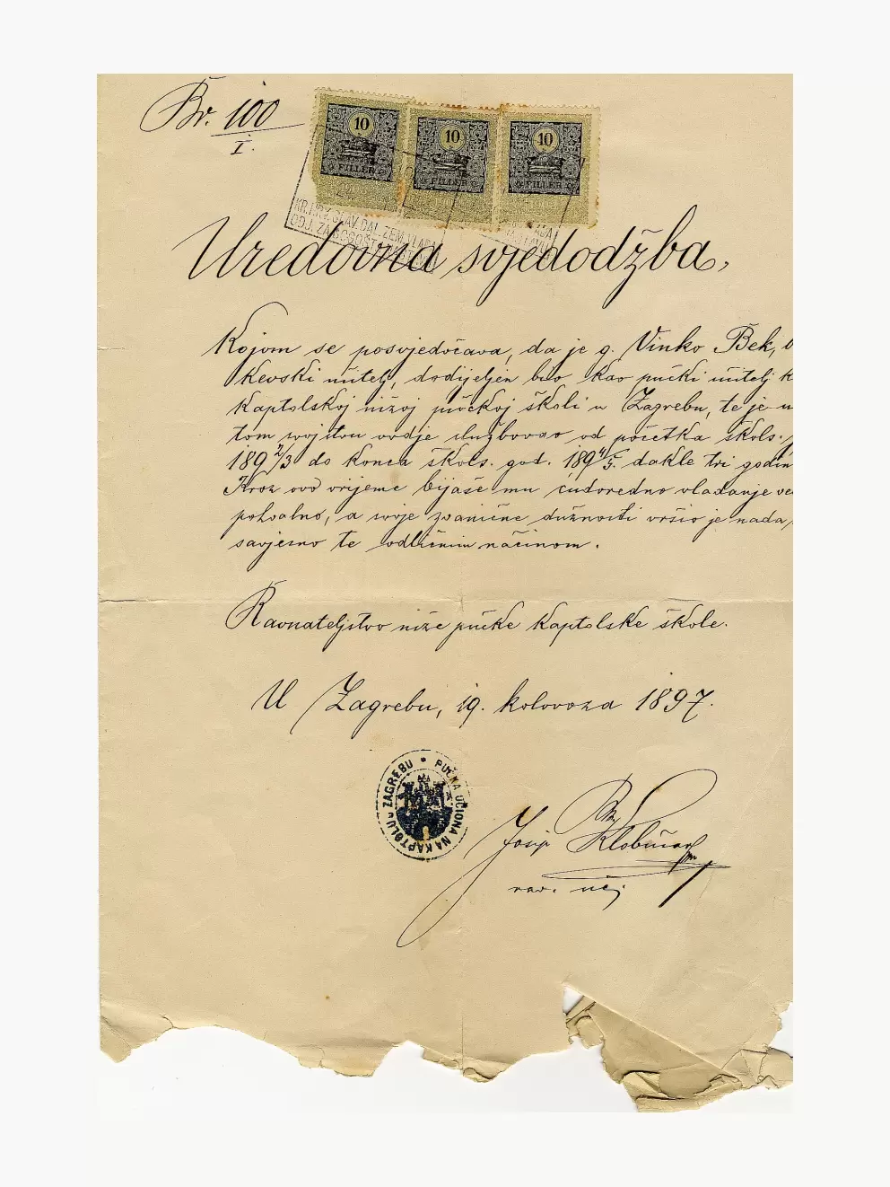 Izložena je rukom pisana svjedodžba kojom se potvrđuje da je Vinko Bek radio kao učitelj na nižoj pučkoj školi od 1892. do kraja školske godine 1895. U dokumentu se ističe da je svoju dužnost obavljao temeljito i da je njegovo ponašanje bilo vrlo pohvalno. Svjedodžba je ovjerena pečatom Pučke učione na Kaptolu i potpisom ravnatelja Josipa Klobučara.